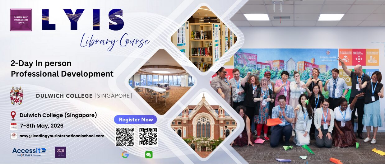 The latest ‘Leading Your International School Library’ course is set to take place at Dulwich College (Singapore) on the 7th and 8th of May 2026. This two-day workshop, hosted by LYIS, is designed for library professionals in international schools who are looking to enhance their strategic impact and leadership. The course has been carefully tailored for the Asian international school context, making it immediately relevant for librarians from IB, British, American, and other curriculum schools.